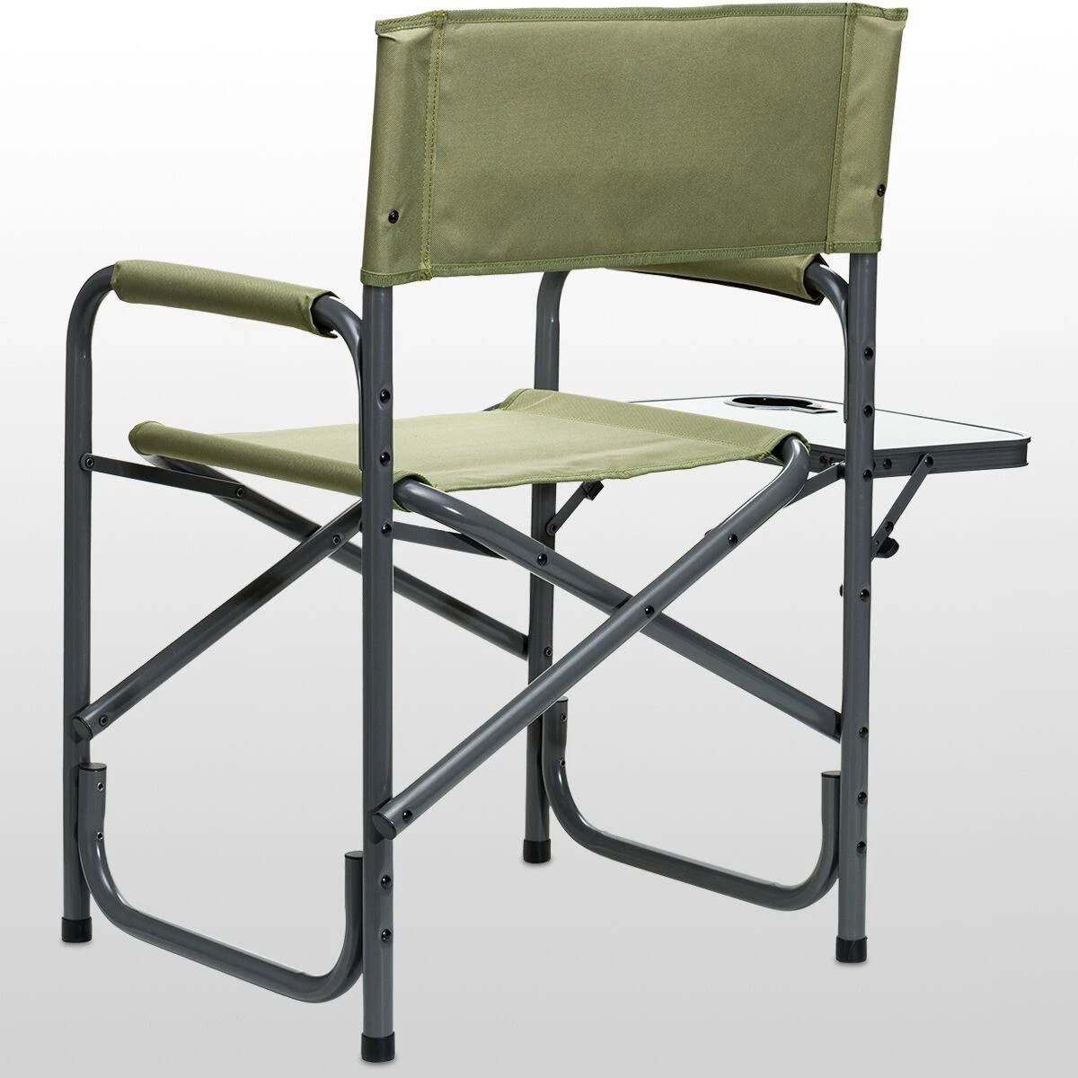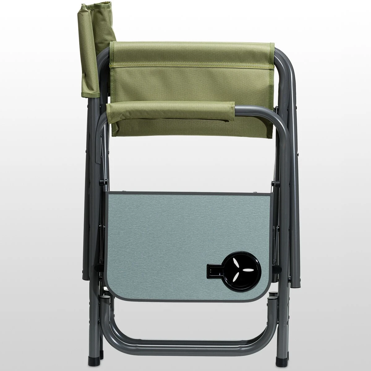 - Folding side table includes a cup holder for securing beverages